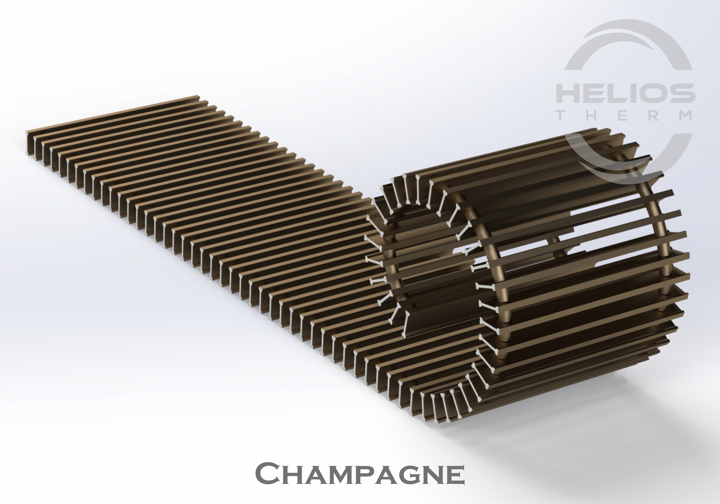 Параметры продукции Высота решетки 23 мм. Все возможные размеры для конвекторов шириной 200, 250, 300, 350, 400 и длиной от 800 до 5000 Площадь живого сечения 66,5% Техническое описание продукции Поперечная (рулонная) декоративная решетка из алюминиевого профиля с анодированным покрытием различных цветов (серебро, золото, черный, шоколад, шампань).