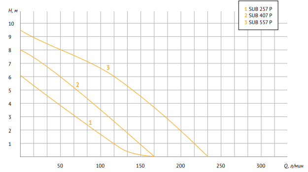 Дренажные насосы для воды от производителя UNIPUMP серии SUBДренажные насосы серии SUB — предназначены для отвода сточных дождевых вод, осушения контейнеров, лодок или яхт, откачивания воды из колодцев и шахт, перекачивания чистой или грязной воды (максимальный размер механических включений — 5 мм), воды, содержащей моющие средства, для откачивания воды из плавательных бассейнов, для распыления воды и для обеспечения циркуляции в течение ограниченного промежутка времени. Насосы имеют герметичный корпус, могут работать частично или полностью погруженными в воду (глубина погружения в перекачиваемую жидкость до 8 метров). Насосы имеют встроенный поплавковый выключатель. Напорно-расходные характеристики
