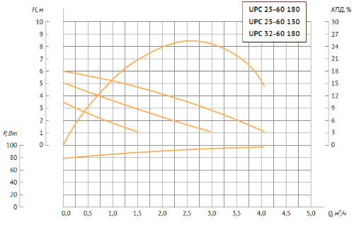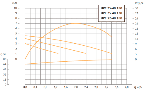 Циркуляционные насосы для отопления и водоснабжения UNIPUMP серии UPCЦиркуляционные насосы UNIPUMP серии UPC — с «мокрым» ротором предназначены для перекачивания рабочих жидкостей в системах отопления при стабильном или слабо меняющемся расходе. Насосы имеют три ступени мощности (кроме моделей UPC 25-160, UPC 25-200, UPC 32-120), регулировка мощности производится механическим трехпозиционным переключателем. Технические характеристики