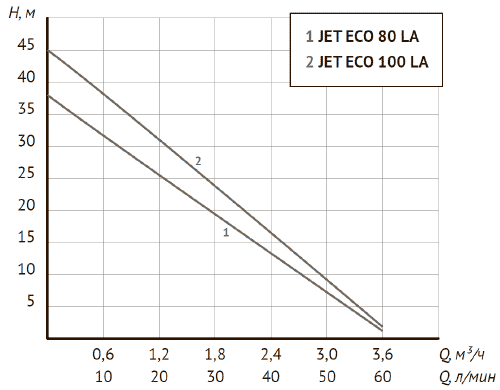 Насосные станции UNIPUMP серии AUTO ECO JET LAСтанции автоматического водоснабжения серии AUTO ECO JET LA — на основе центробежного поверхностного насоса c удлиненным встроенным эжектором ECO JET LA и гидроаккумулятора емкостью 5, 24 (или 20) или 50 л, предназначены для подачи чистой воды из скважин, колодцев и других источников и поддержания давления воды в системе водоснабжения в автоматическом режиме. В воде не должны содержаться частицы с линейным размером более 1 мм, общее количество механических примесей — не более 100 г/м³, диапазон рабочих температур воды от +1°С до +35°С. Напорно-расходные характеристики