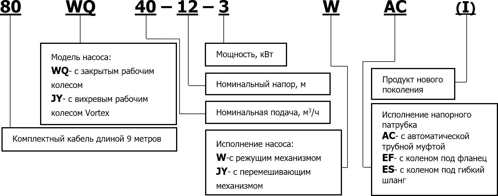 WQ, JYWQ - усовершенствованный тип насосов для откачки сточных вод, с оптимальной гидравлической частью, надежной конструкцией и системой защит, что делает их более долговечными и безопасными. WQF - погружной насос для отвода сточных вод, выполненный из нержавеющей стали. Разработан для применения в шахтах, строительстве, жилищно-коммунальном секторе, обработке сточных вод. WQ-F - малогабаритный погружной насос для отвода сточных вод, корпусные детали которого выполненны из нержавеющей стали AISI 304 или AISI 316. WQAS - погружной насос для отвода сточных вод с режущим рабочим колесом, которое совместно со специальной пластиной, установленной в корпусе насоса, может измельчать волокнистые частицы, находящиеся в перекачиваемой жидкости. WQ-A - промышленный погружной насос для отвода сточных вод, который широко используется в строительстве, промышленных предприятиях, сельском хозяйстве, лесном хозяйстве, земледелии. Это переносной канализационный насос.