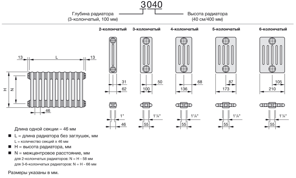 от 62 до 210 мм (от 2 до 6 колонок в секции) макс. 110 °С
