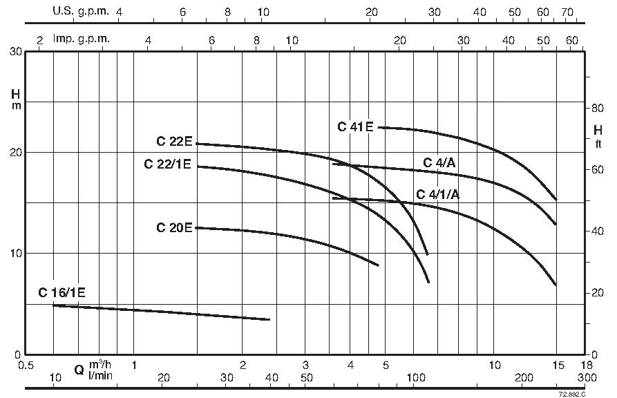 Одноступенчатые насосы Calpeda CНасосы Calpeda серии С имеют моноблочный тип и центробежный самовсасывающий механизм работы и являются специализированным оборудованием, подходящим для профессионального использования. Может поднимать воду при заполнении камеры насоса и всасывающей трубы. Подходят для чистых жидкостей (жидкости без примеси), а также жидкостей, имеющих в своем составе примеси (например, эмульсии и включения газообразных веществ). Специальные исполнения этих насосов могут работать с морской водой и соляными растворами, растворами на основе воды с включением этиленгликоля и пропиленгликоля, а также с другим напряжением и температурой. Помимо этого, насосы Calpeda серии C подходят для перекачивания масла и горючих жидкостей. ДвигательПроизводительность 0.6–15 м³/ч
