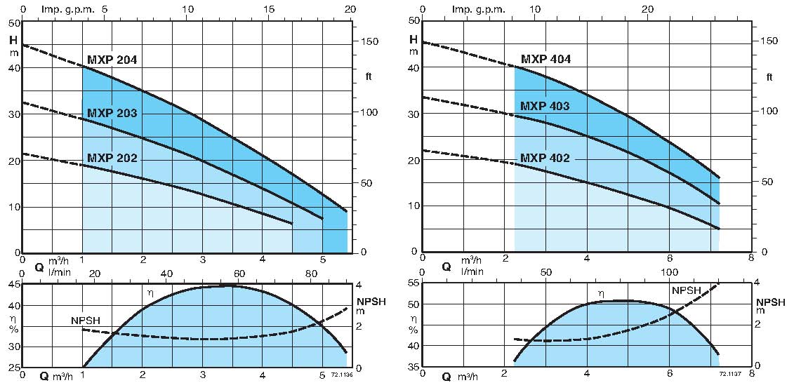 Многоступенчатые насосы Calpeda MXP CalpedaКонструкция Горизонтальный многоступенчатый моноблочный насос. Применение - Для водоснабжения. ДвигательПроизводительность 1–7.2 м³/ч