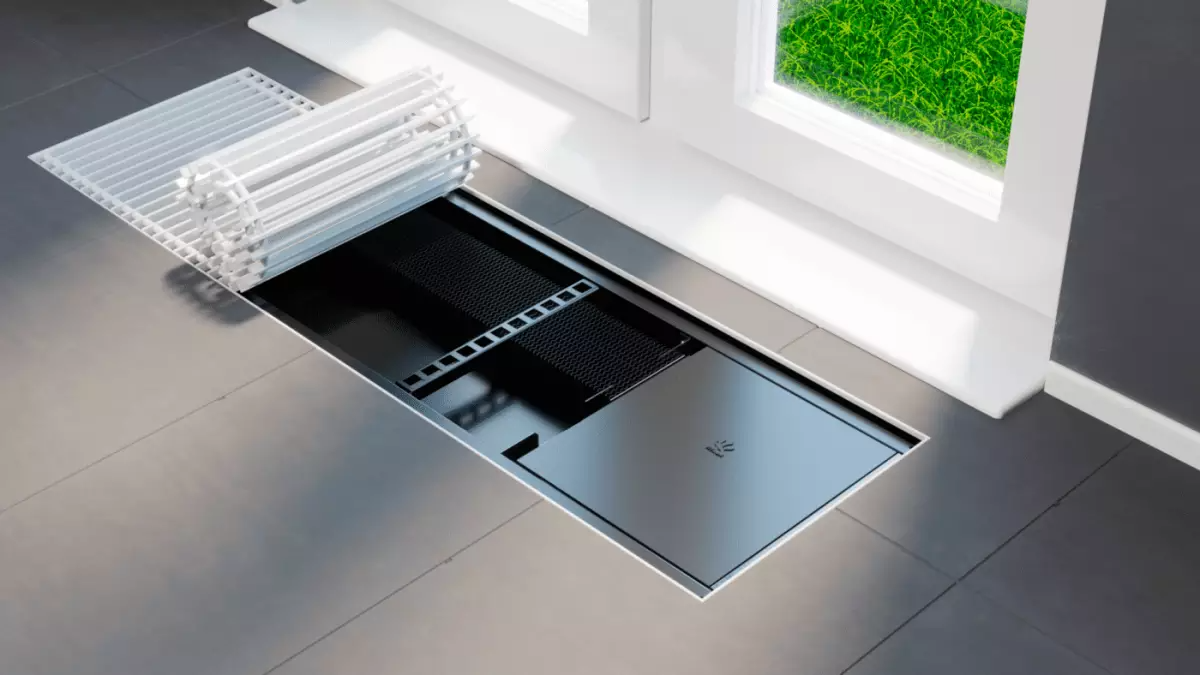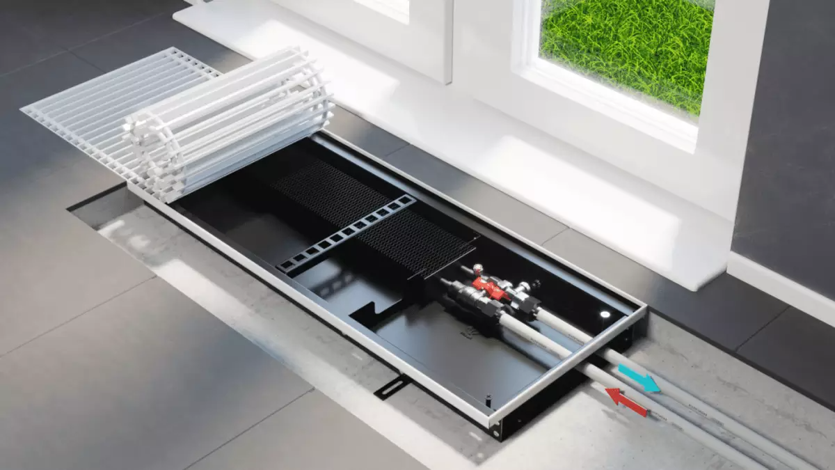 Внутрипольные радиаторы отопления VITRON ВК.055.300.2ТГ Высота конвекторов 55 мм.Внутрипольные радиаторы отопления ВК.055.300.2ТГ, используют циркуляцию воздуха для нагрева, а не излучения, как в случае обычных радиаторов. Циркуляция создается восходящим нагретым воздухом. Воздух циркулирует внутри комнаты, и температурные различия во всей комнате минимальны. Тепло в комнате более приятное и естественное. Другим преимуществом конвекторов VITRON является их низкая температура поверхности. Благодаря методу теплопередачи передние панели нагреваются до макс. температуры 40°C, даже при температуре воды 90°C. В результате нет опасности, даже при длительном контакте - подходит для школ, детских садов, детских комнат и т.д. Передача тепла в помещение происходит в теплообменнике или так называемом регистре, который состоит из медной трубы, на которую были механически установлены алюминиевые ламели. Поток горячей воды через теплообменник нагревает трубу. Это, в свою очередь, нагревает ламели, которые начинают нагревать окружающий воздух - это явление называется конвективной теплой циркуляцией воздуха. При разработке новой формы ламелей AL мы стремились включить все новые знания в их дизайн. Новой особенностью является уникальная горизонтальная рифленая поверхность пластин в направлении потока воздуха, что приводит к лучшему переносу тепла в помещение - при прохождении через теплообменник воздух становится более турбулентным.