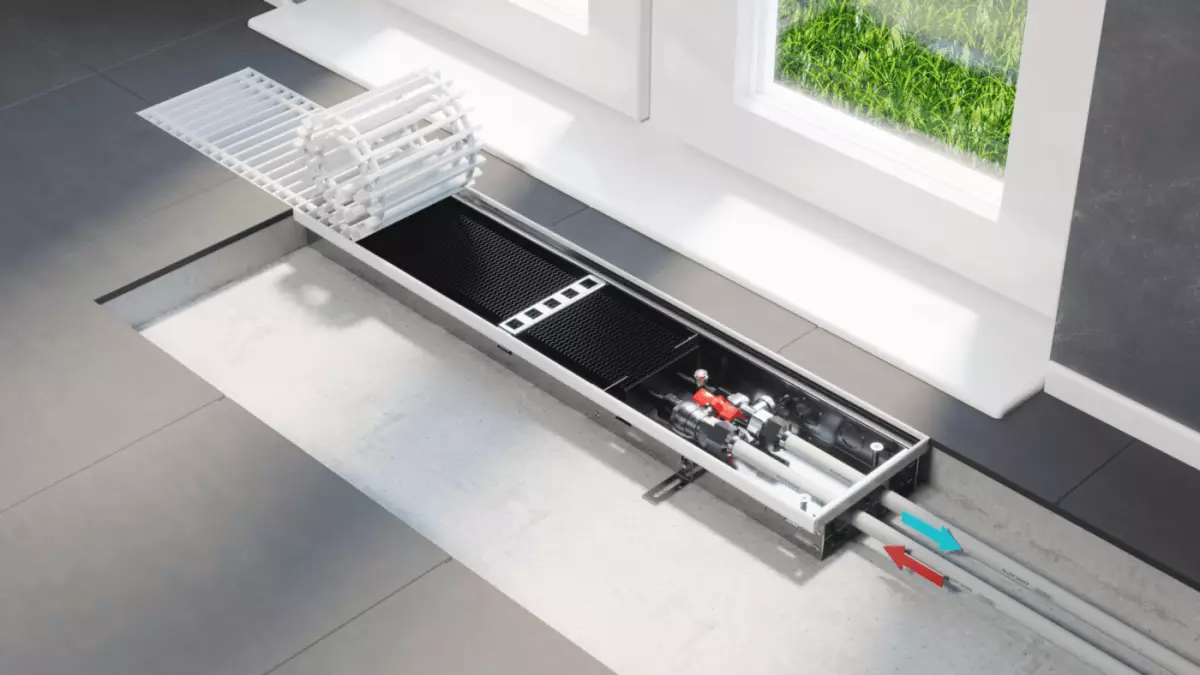 Внутрипольные конвекторы отопления VITRON ВК.055.160.2ТГ Высота конвекторов 55 мм.Внутрипольные конвекторы отопления ВК.055.160.2ТГ, используют циркуляцию воздуха для нагрева, а не излучение, как в случае обычных радиаторов. Циркуляция создается восходящим нагретым воздухом. Воздух циркулирует внутри комнаты, и температурные различия во всей комнате минимальны. Тепло в комнате более приятное и естественное. Другим преимуществом внутрипольных конвекторов VITRON является их низкая температура поверхности. Благодаря методу теплопередачи передние панели нагреваются до макс. температуры 40°C, даже при температуре воды 90°C. В результате нет опасности, даже при длительном контакте - подходит для школ, детских садов, детских комнат и т.д. Передача тепла в помещение происходит в теплообменнике или так называемом регистре, который состоит из медной трубы, на которую были механически установлены алюминиевые ламели. Поток горячей воды через теплообменник нагревает трубу. Это, в свою очередь, нагревает ламели, которые начинают нагревать окружающий воздух - это явление называется конвективной теплой циркуляцией воздуха. При разработке новой формы ламелей AL мы стремились включить все новые знания в их дизайн. Новой особенностью является уникальная горизонтальная рифленая поверхность пластин в направлении потока воздуха, что приводит к лучшему переносу тепла в помещение - при прохождении через теплообменник воздух становится более турбулентным.