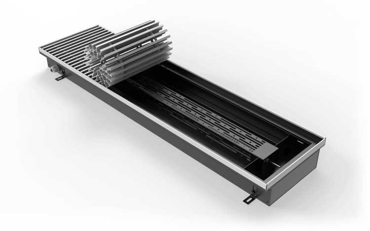 Конвекторы электрические внутрипольные VITRON ВКЭ.90.260Конвектор VITRON состоит из корпуса, декоративной решётки, декоративной рамки, электронагревательного прибора, внутреннего кожуха и регулятора мощности Витрон . Корпус конвектора представляет собой короб длиной L от 700 до 3000 мм. Изготовлен из листовой оцинкованной стали 1 мм с порошковой покраской (цвет покрытия: черный матовый). Слева расположены отверстия для сальника и заземления корпуса конвектора. По бокам расположены крепления для регулировочных ножек. Ножки крепежно - регулировочные позволяют регулировать корпус конвектора по высоте от 0 до 40 мм. Внизу короба расположены крепления для юстировочных винтов. Они позволяют регулировать корпус конвектора в горизонтальной плоскости. В верхней части короба установлена декоративная рамка, выполненная из углового алюминиевого профиля. В конструкции конвектора использован электронагревательный прибор ( ТЭН ) в виде металлической трубки, заполненной теплопроводящим электрическим изолятором. Точно по центру изолятора проходит токопроводящая нихромовая нить определенного сопротивления для передачи необходимой удельной мощности на поверхность ТЭН. С левой стороны конвектора расположено цифровое табло и кнопки регулятора мощности. С помощью кнопок можно плавно регулировать мощность конвектора от 0 до 100 %, а цифровое табло подскажет заданный уровень мощности.