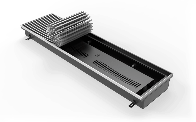 Внутрипольные электрические конвекторы отопления VITRON ВКВЭ.110.260 с принудительной конвекцией.Конвектор VITRON состоит из корпуса, декоративной решётки, декоративной рамки, электронагревательного прибора, внутреннего кожуха и регулятора мощности Витрон . Корпус конвектора представляет собой короб длиной L от 700 до 3000 мм. Изготовлен из листовой оцинкованной стали 1 мм с порошковой покраской (цвет покрытия: черный матовый). Слева расположены отверстия для сальника и заземления корпуса конвектора. По бокам расположены крепления для регулировочных ножек. Ножки крепежно - регулировочные позволяют регулировать корпус конвектора по высоте от 0 до 40 мм. Внизу короба расположены крепления для юстировочных винтов. Они позволяют регулировать корпус конвектора в горизонтальной плоскости. В верхней части короба установлена декоративная рамка, выполненная из углового алюминиевого профиля. В конструкции конвектора использован электронагревательный прибор ( ТЭН ) в виде металлической трубки, заполненной теплопроводящим электрическим изолятором. Точно по центру изолятора проходит токопроводящая нихромовая нить определенного сопротивления для передачи необходимой удельной мощности на поверхность ТЭН.