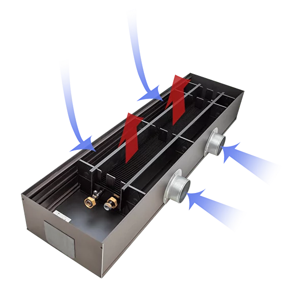 3 задачи одного прибора: тепловая завеса, отопление, вентиляцияWLKP создан для помещений с панорамными окнами без естественной вентиляции: офисы, торговые центры, выставочные залы. К конвектору подключается система подачи приточного воздуха. Свежий холодный воздух проходит сначала через конвектор и поступает в помещение нагретым. Стекающий холодный воздух также попадает в конвектор — образуется тепловая завеса. WLKP в одиночку способен создать комфортный микроклимат в помещении.
