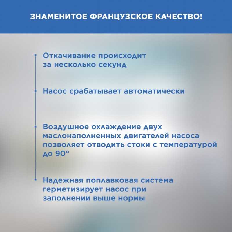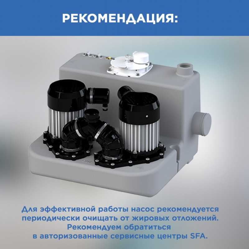 Данная модель насоса без системы измельчения, поэтому для подключения унитаза не используется. Отлично подходит для перекачивания стоков больших объемных расходов от профессиональной кухни или прачечной. Модель эффективно справляется с высоким нагрузками, она создана с учетом интенсивного режима работы. Подойдет как для частных жилых объектов (дома, дачи), так и для общественных мест (кафе, рестораны, прачечные, салоны красоты, фитнес-центры). Sanicom 2 оснащен двумя двигателями повышенной мощности 1500 Вт, которые позволяет откачивать стоки на расстояние до 110 метров по горизонтали и до 11 — по вертикали. Выдерживает температуру стоков до 90 °С (короткие периоды). Если стационарная канализация находится далеко или отсутствует, то установка этой модели санитарного насоса от SFA позволит быстро и легко оборудовать комфортабельную прачечную, ванную или кухню в любом месте. Sanicom 2 имеет международные сертификаты качества, он надежен и эффективен. Размер упаковки (см): 60х60x66.