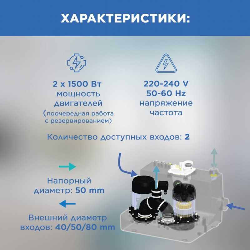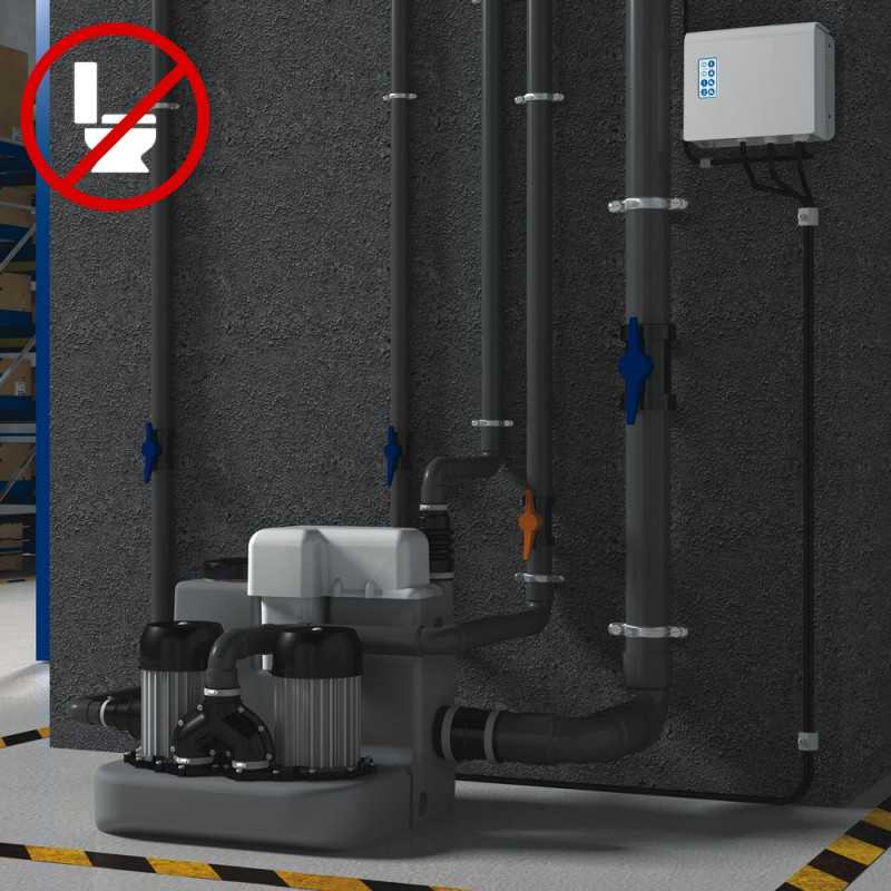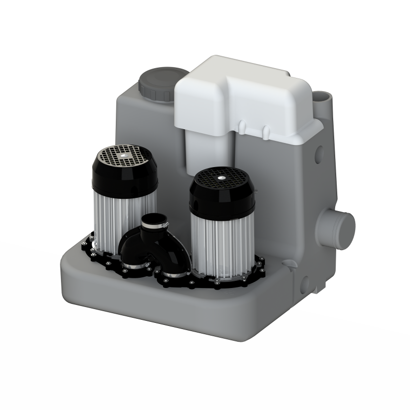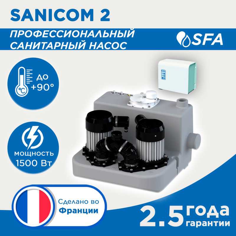 Sanicom 2 — еще более мощный насос для откачивания грязных стоков. Оснащен двумя двигателями по 1500 Вт каждый. Подходит для использования в барах, ресторанах, кафе и прачечных.