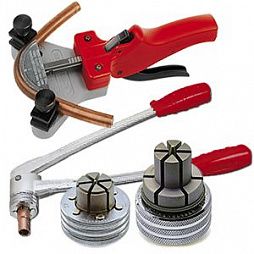 Горелки предназначена для пайки медных труб и фитингов, разогрева деталей, а также изгибания труб. Трубогиб необходим, чтобы сгибать медные трубы, не нанося вреда внутренней и внешней поверхности изделий. Труборез для медных труб позволяет резать изделия, не повреждая их сечения. Полученные в итоге детали, могут не требуют дополнительной обработки и могут быть использованы в монтаже. Экспандер (труборасширитель) для медных труб используется для увеличения диаметра изделия перед пайкой. Развальцовщик для медных труб используют для изменения размера и формы медных труб в процессе подготовки к пайке. Фаскосниматель (гратосниматель) применяют для обрезки кромок и заусенцев в ходе подготовки медных труб к пайке. |