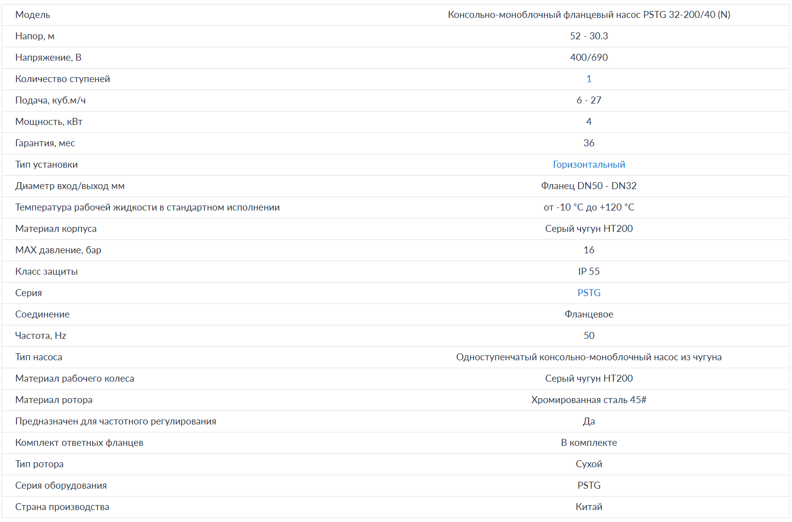 Консольно-моноблочный фланцевый насос PURITY PSTG 32-200/40 (N), Артикул: 100602779Для перекачивания жидкостей, не агрессивных по отношению к материалам насоса. Рекомендованы для использования в системах водоснабжения, на станциях повышения давления, в противопожарных установках, в ирригации, в промышленности, для циркуляции воды в климатических установках, в сельском хозяйстве. Характеристики PURITY PSTG 32-200/40 (N)