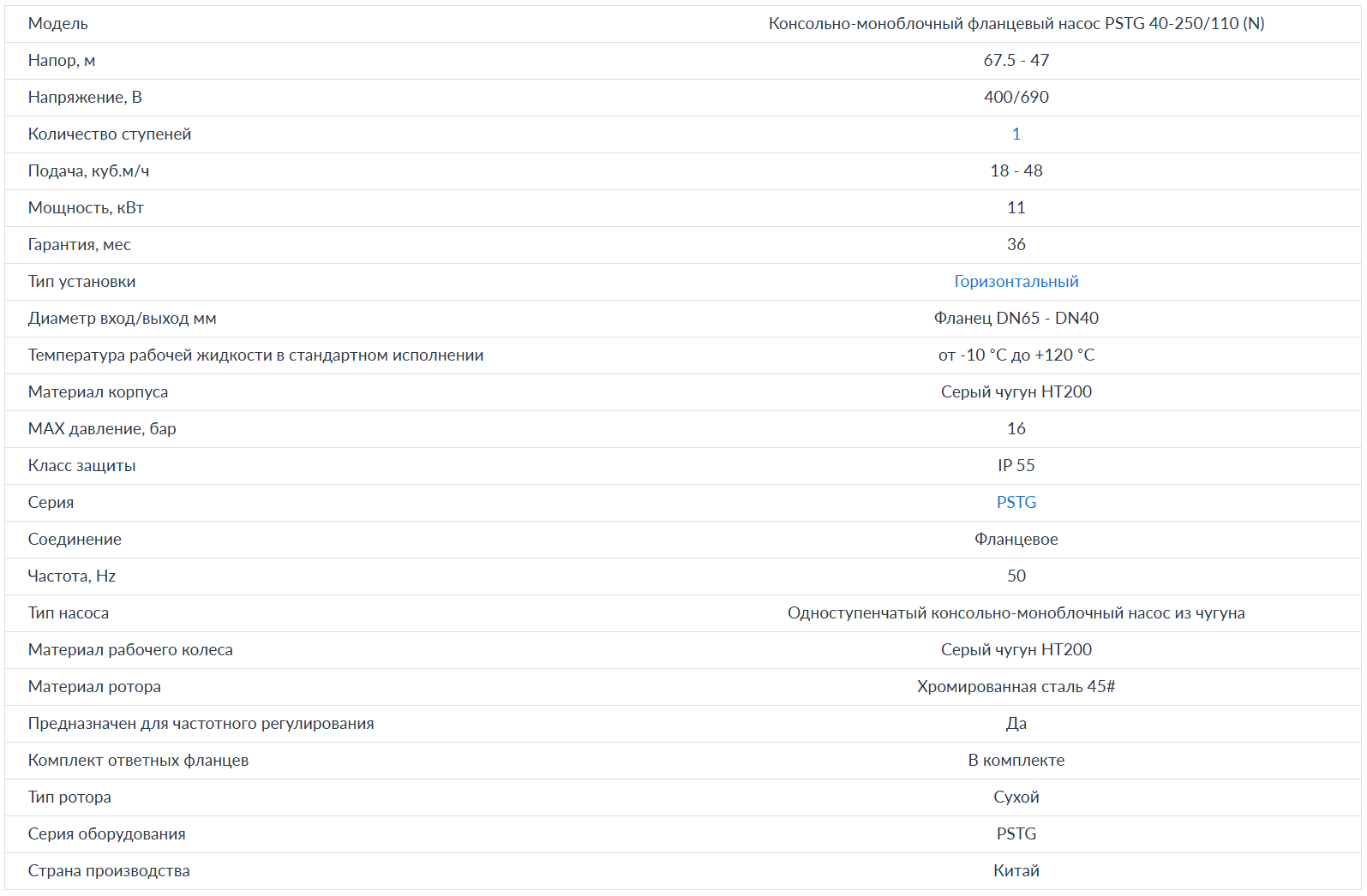 Консольно-моноблочный фланцевый насос PSTG 40-250/110 (N), Артикул: 100602793Для перекачивания жидкостей, не агрессивных по отношению к материалам насоса. Рекомендованы для использования в системах водоснабжения, на станциях повышения давления, в противопожарных установках, в ирригации, в промышленности, для циркуляции воды в климатических установках, в сельском хозяйстве. Характеристики PURITY PSTG 40-250/110 (N)