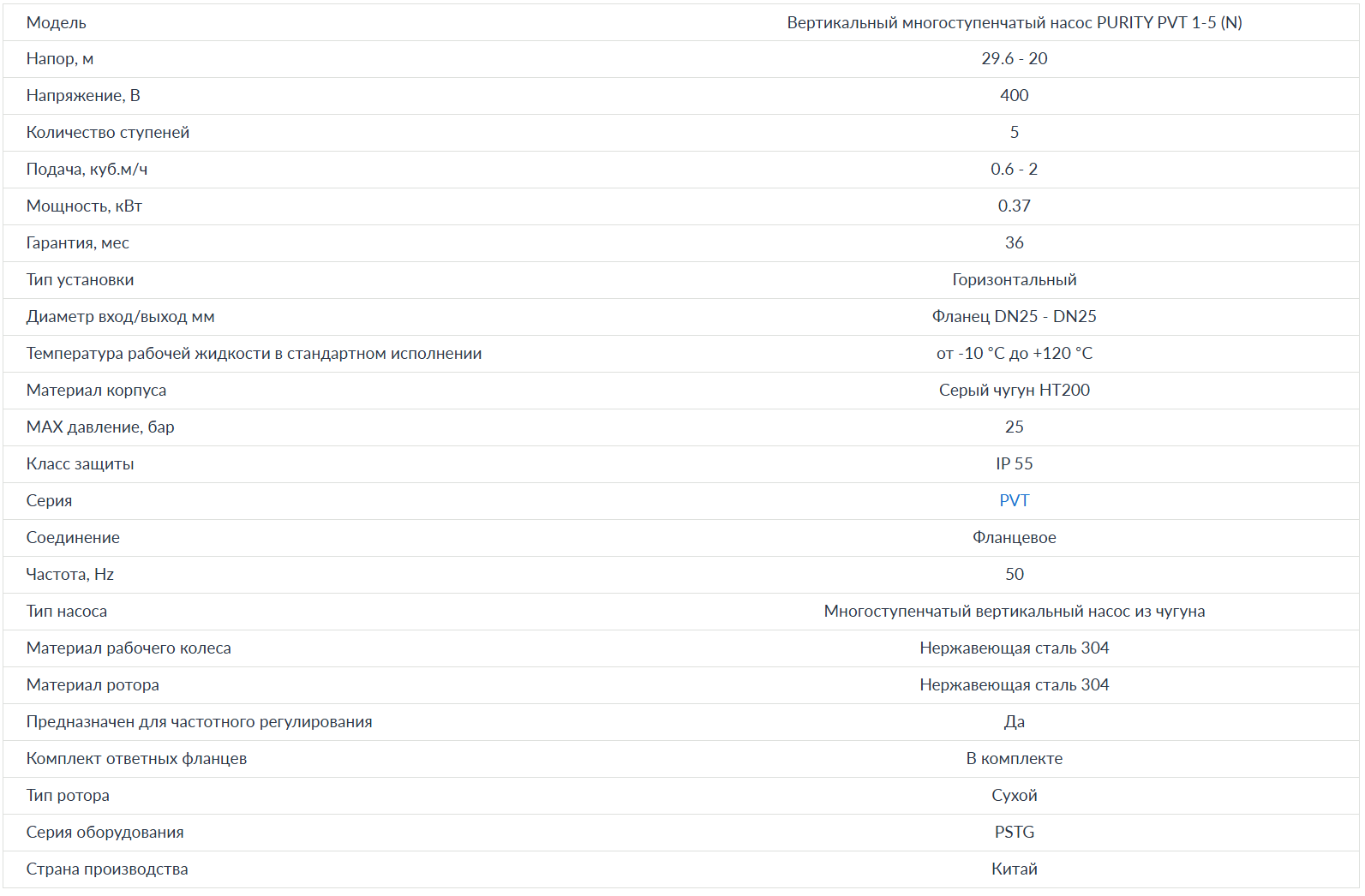 Насос вертикальный многоступенчатый PURITY PVT 1-5 (N)Вертикальный многоступенчатый насос Purity PVT предназначен для промышленных систем обработки, промывки и очистки, для перекачки слабых растворов, кислот и щелочей, для систем фильтрации, повышения давления воды, водоподготовки, для систем отопления, вентиляции и кондиционирования, для рригации, для противопожарных систем и т.д. Корпус и рабочие колеса выполнены из нержавеющей стали и чугуна, что обеспечивает прочность и устойчивость к образованию коррозии. Технические характеристики PURITY PVT 1-5 (N)
