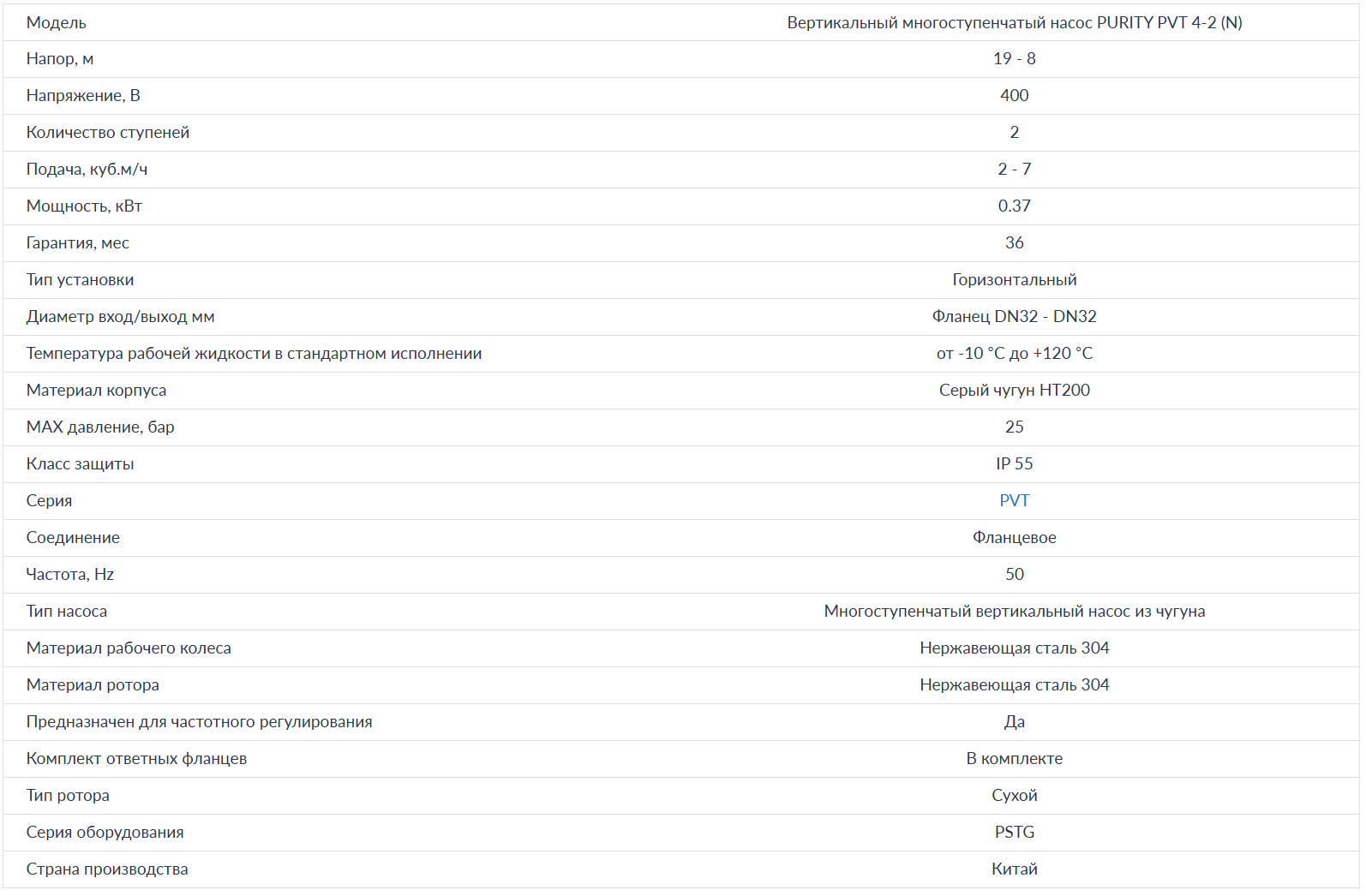Насос вертикальный многоступенчатый PURITY PVT 4-2 (N)Вертикальный многоступенчатый насос Purity PVT предназначен для промышленных систем обработки, промывки и очистки, для перекачки слабых растворов, кислот и щелочей, для систем фильтрации, повышения давления воды, водоподготовки, для систем отопления, вентиляции и кондиционирования, для рригации, для противопожарных систем и т.д. Корпус и рабочие колеса выполнены из нержавеющей стали и чугуна, что обеспечивает прочность и устойчивость к образованию коррозии. Технические характеристики PURITY PVT 4-2 (N)