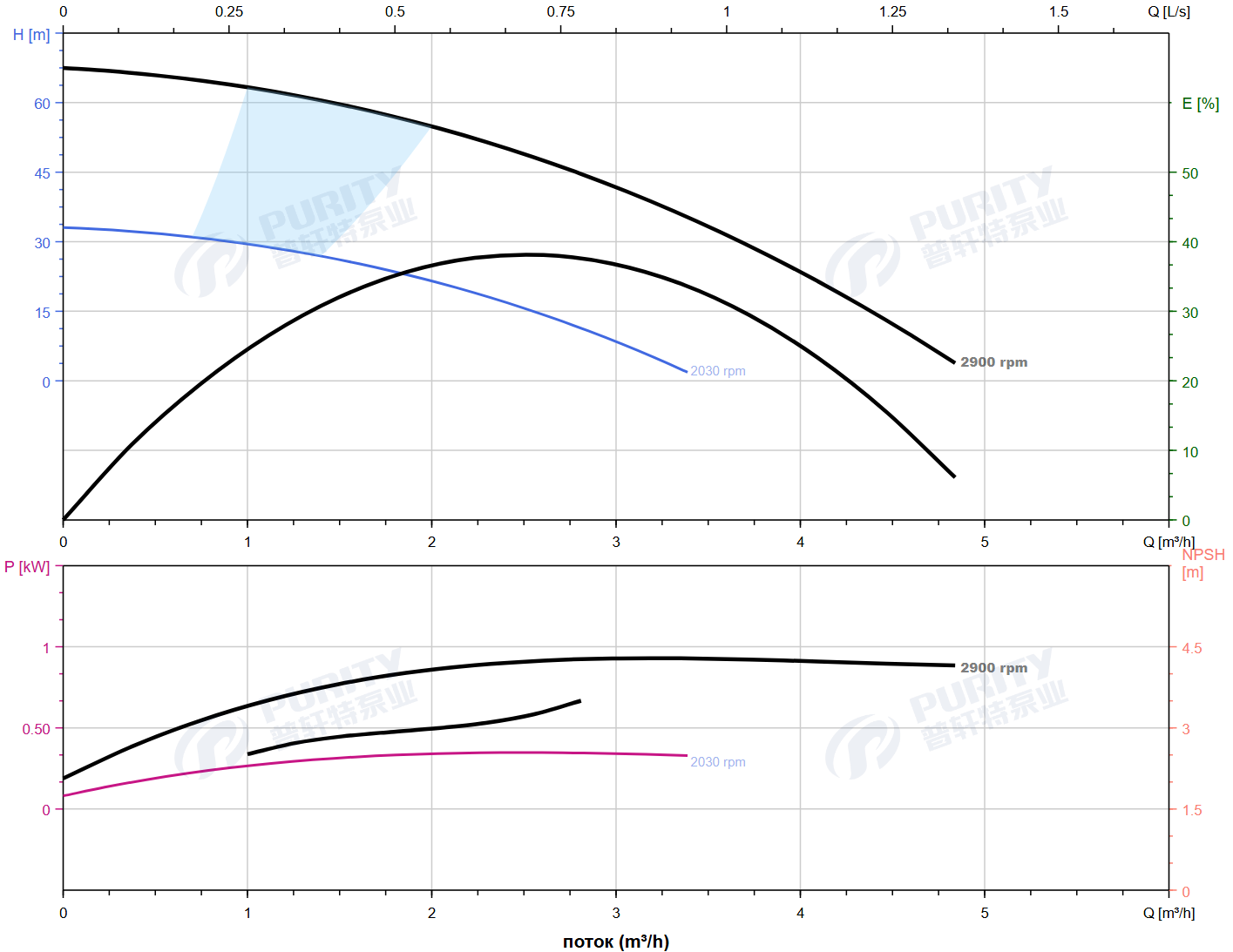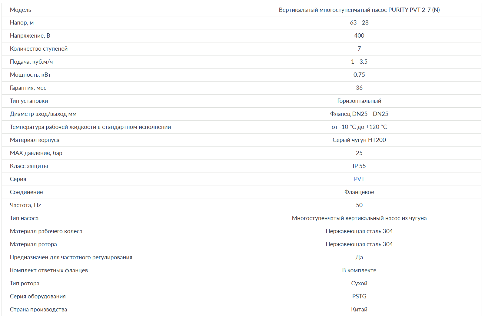 Насос вертикальный многоступенчатый PURITY PVT 2-7 (N)Вертикальный многоступенчатый насос PURITY PVT 2-7 (N) предназначен для промышленных систем обработки, промывки и очистки, для перекачки слабых растворов, кислот и щелочей, для систем фильтрации, повышения давления воды, водоподготовки, для систем отопления, вентиляции и кондиционирования, для рригации, для противопожарных систем и т.д. Корпус и рабочие колеса выполнены из нержавеющей стали и чугуна, что обеспечивает прочность и устойчивость к образованию коррозии. Технические характеристики PURITY PVT 2-7 (N)