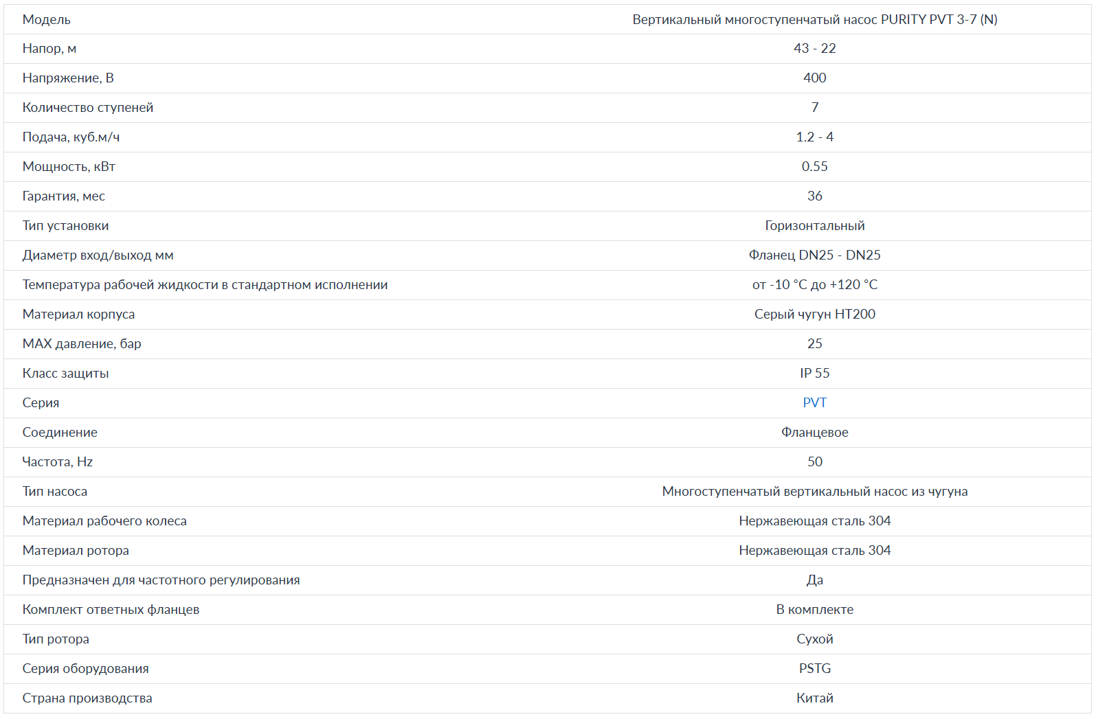 Насос вертикальный многоступенчатый PURITY PVT 3-7 (N)Вертикальный многоступенчатый насос PURITY PVT 3-7 (N) предназначен для промышленных систем обработки, промывки и очистки, для перекачки слабых растворов, кислот и щелочей, для систем фильтрации, повышения давления воды, водоподготовки, для систем отопления, вентиляции и кондиционирования, для противопожарных систем и т.д. Корпус и рабочие колеса выполнены из нержавеющей стали и чугуна, что обеспечивает прочность и устойчивость к образованию коррозии. Технические характеристики PURITY PVT 3-7 (N)