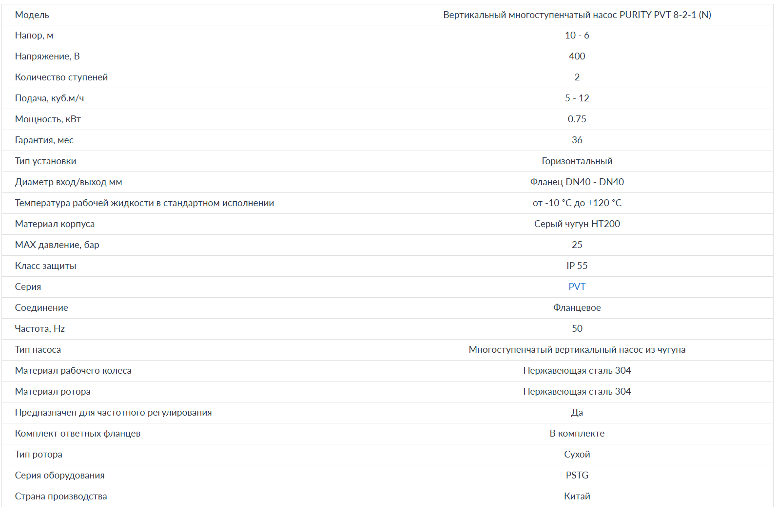 Насос вертикальный многоступенчатый PURITY PVT 8-2-1 (N)Вертикальный многоступенчатый насос PURITY PVT 8-2-1 (N) предназначен для промышленных систем обработки, промывки и очистки, для перекачки слабых растворов, кислот и щелочей, для систем фильтрации, повышения давления воды, водоподготовки, для систем отопления, вентиляции и кондиционирования, для противопожарных систем и т.д. Корпус и рабочие колеса выполнены из нержавеющей стали и чугуна, что обеспечивает прочность и устойчивость к образованию коррозии. Технические характеристики PURITY PVT 8-2-1 (N)