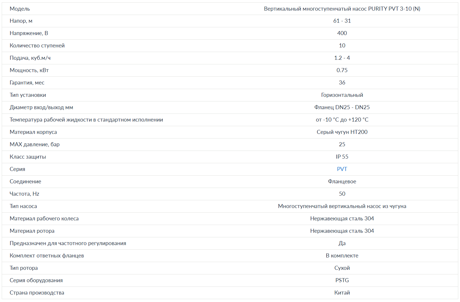Насос вертикальный многоступенчатый PURITY PVT 3-10 (N)Вертикальный многоступенчатый насос PURITY PVT 3-10 (N) предназначен для промышленных систем обработки, промывки и очистки, для перекачки слабых растворов, кислот и щелочей, для систем фильтрации, повышения давления воды, водоподготовки, для систем отопления, вентиляции и кондиционирования, для противопожарных систем и т.д. Корпус и рабочие колеса выполнены из нержавеющей стали и чугуна, что обеспечивает прочность и устойчивость к образованию коррозии. Технические характеристики PURITY PVT 3-10 (N)