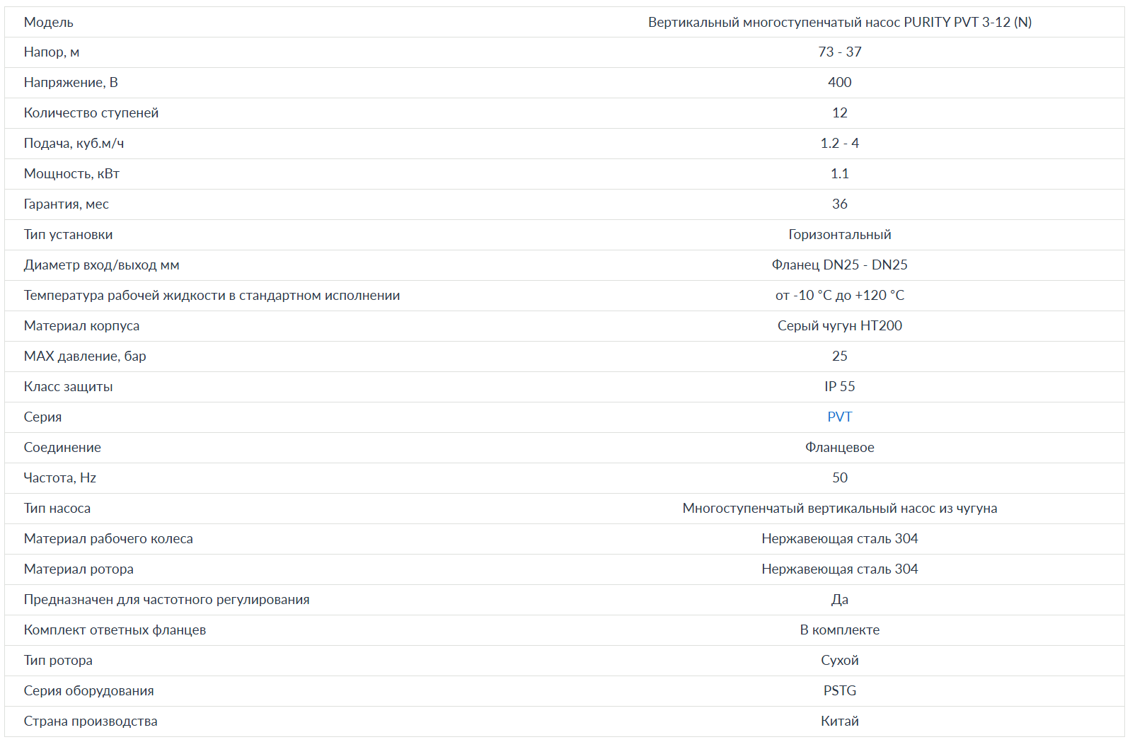 Насос вертикальный многоступенчатый PURITY PVT 3-12 (N)Вертикальный многоступенчатый насос PURITY PVT 3-12 (N) предназначен для промышленных систем обработки, промывки и очистки, для перекачки слабых растворов, кислот и щелочей, для систем фильтрации, повышения давления воды, водоподготовки, для систем отопления, вентиляции и кондиционирования, для противопожарных систем и т.д. Корпус и рабочие колеса выполнены из нержавеющей стали и чугуна, что обеспечивает прочность и устойчивость к образованию коррозии. Технические характеристики PURITY PVT 3-12 (N)