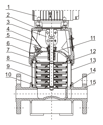 Насос состоит из основания и головной части. Промежуточные камеры и цилиндрический кожух соединены между собой, а также с основанием и головной частью при помощи стяжных болтов. Всасывающий и напорный патрубки находятся в основании насоса и расположены соосно (конструкция «ин-лайн»), что позволяет устанавливать насос на горизонтальном трубопроводе. Все насосы оснащаются необслуживаемым торцевым механическим уплотнением вала картриджевого типа.