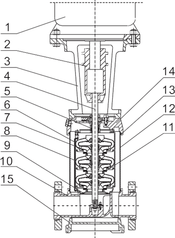 Насос состоит из основания и головной части. Промежуточные камеры и цилиндрический кожух соединены между собой, а также с основанием и головной частью при помощи стяжных болтов. Всасывающий и напорный патрубки находятся в основании насоса и расположены соосно (конструкция «ин-лайн»), что позволяет устанавливать насос на горизонтальном трубопроводе. Все насосы оснащаются необслуживаемым торцевым механическим уплотнением вала картриджевого типа.