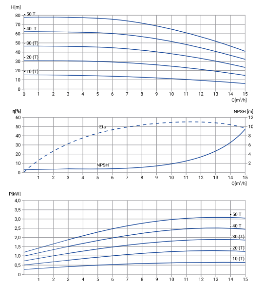 Насосы CMI оснащаются электродвигателями закрытого типа с вентиляторным охлаждением. Ча- стота вращения вала составляет 2900 об/мин, мощность - от 0,25 до 4,0 кВт.