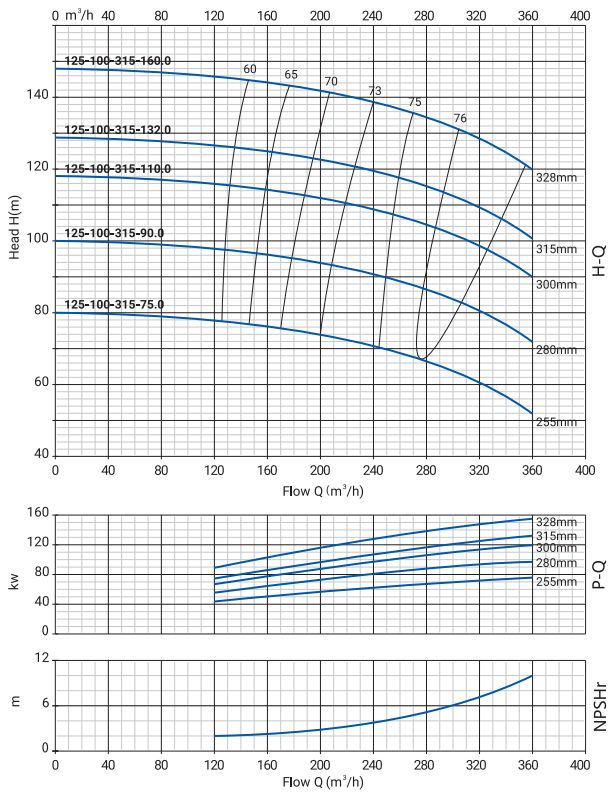 Размеры и номинальные характеристики соответствуют стандарту EN 733. Подача насосов составляет от 0 до 500 м3/ч, напор от 0 до 131 м.