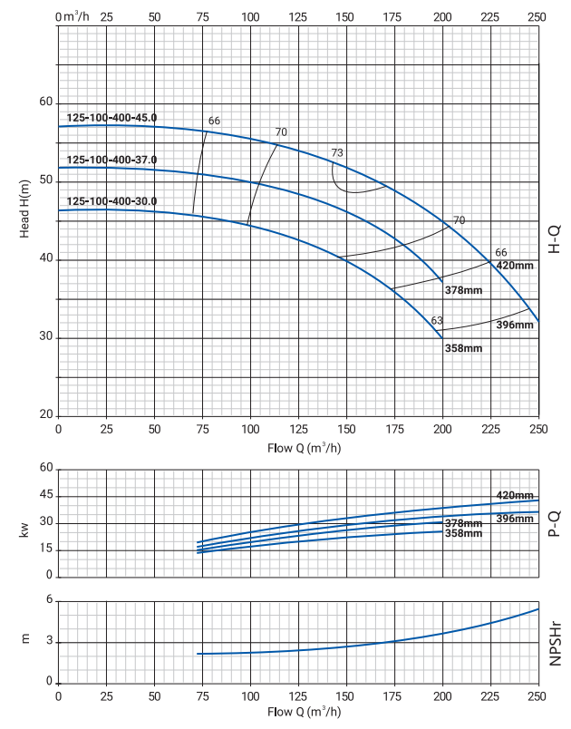 Размеры и номинальные характеристики соответствуют стандарту EN 733. Подача насосов составляет от 0 до 500 м3/ч, напор от 0 до 131 м.