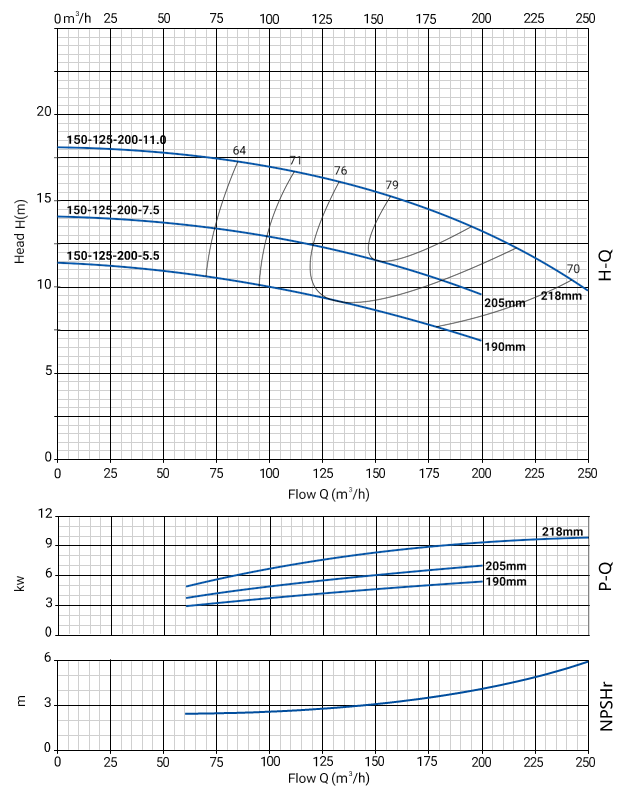Размеры и номинальные характеристики соответствуют стандарту EN 733. Подача насосов составляет от 0 до 500 м3/ч, напор от 0 до 131 м.