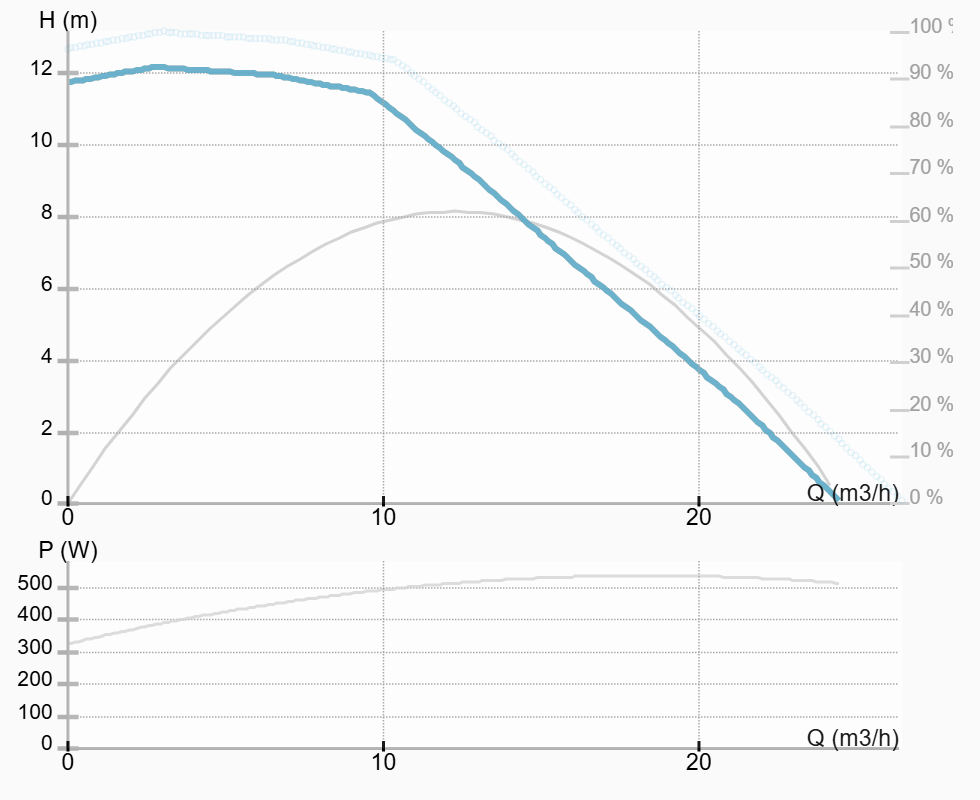 - значения расхода (м3/час), потребляемой мощности (Ватт), напора (м), скорости вращения (об/мин)