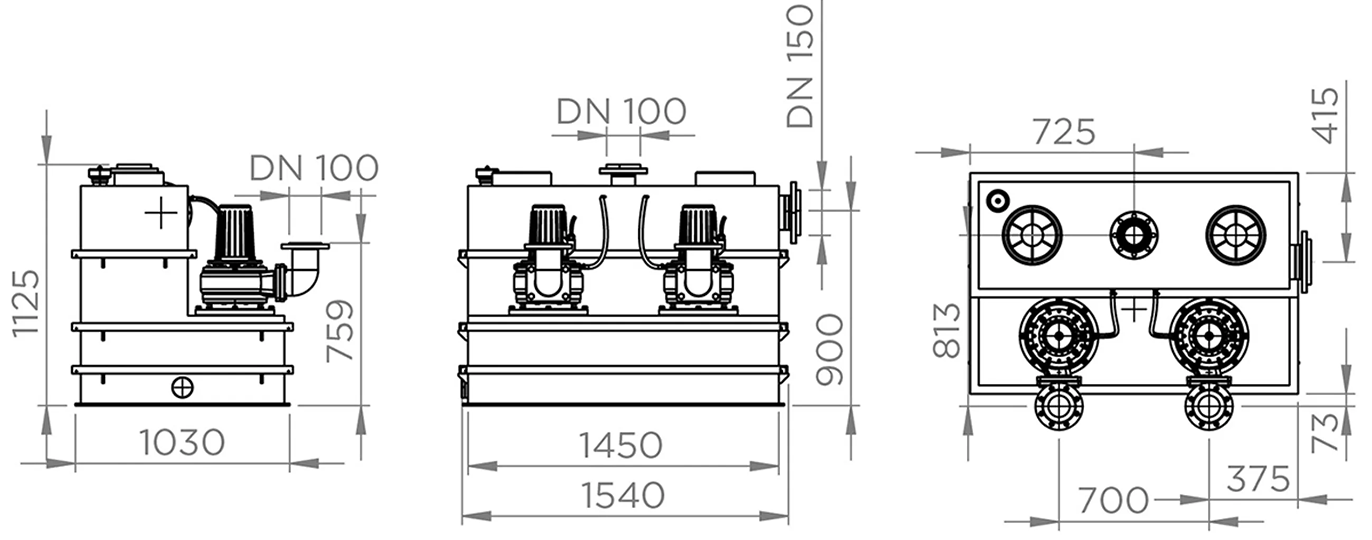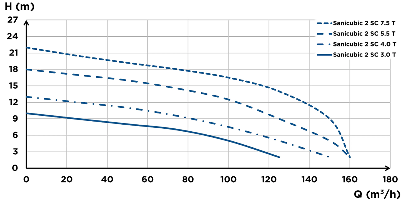 Sanicubic 2 SC доступен в 4 версиях для разных объемных расходов. Модель имеет вход DN 150 для подъема больших объемов сточных вод.